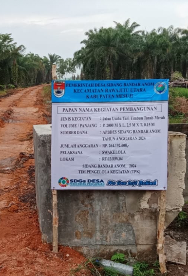 Mesuji- Elvanonews.com.-Pemerintah Desa Sidang Bandar Anom Kecamatan Rawa Jitu Utara Kabupaten Mesuji. Melalui Dana Desa Tahap Kedua Tahun Anggaran 2024. Realisasikan jalan usaha tani timbun tanah merah, bersumber dari Anggaran Pendapatan Belanja Desa (APBDES). Dengan Pagu Anggaran Rp.264.192.000. Kamis,18/07/2024